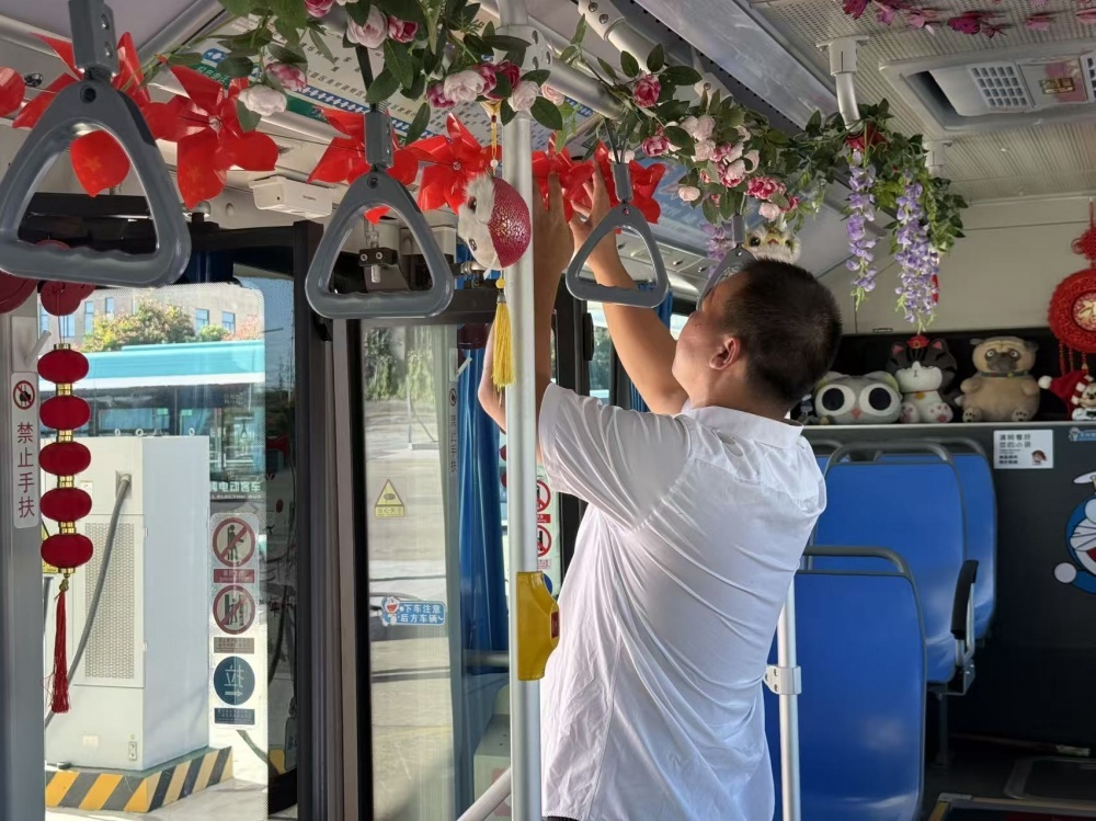 張峻峰是荊門公交2024年度“最美公交人”,他的車上總比別人多點“暖心”東西:駕駛座旁的小盒子里備著暈車藥、創(chuàng)可貼和折疊傘?!敖衲陣鴳c,就想乘客上車能樂呵樂呵。”于是張峻峰就動了裝飾車廂的念頭。他自費買了小國旗、風車、燈籠等裝飾,晚上在家剪剪貼貼,白天利用休息時間在車上裝飾。張峻峰的行動,也是荊門公交服務提升的一個縮影。